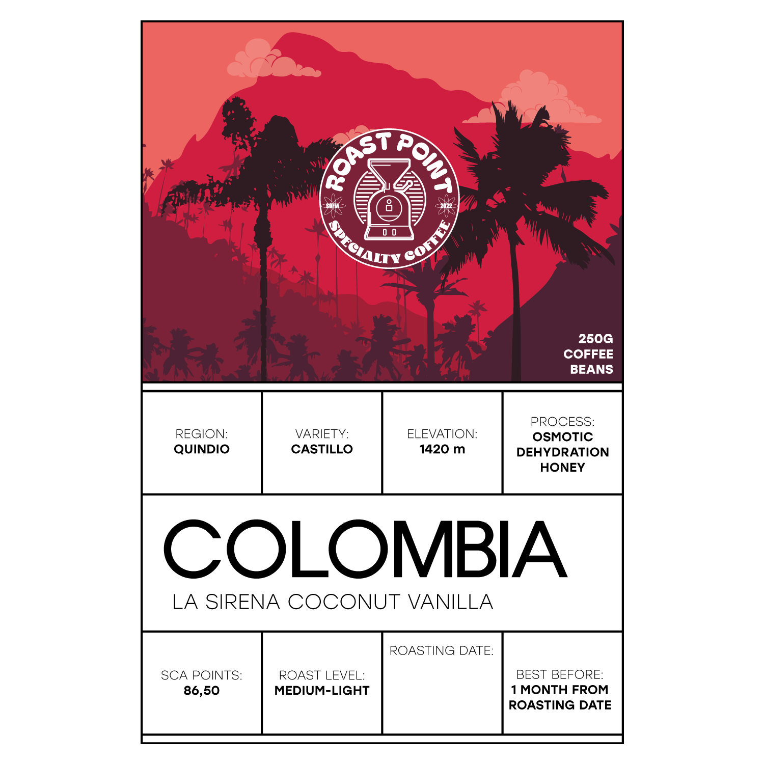 Експериментално кафе от фермата Ла Сирена в Колумбия, отглеждано на 1420 м. Лотът е от сорт Castillo и е обработен чрез ‘меден’ процес с осмотична дехидратация и ко-ферментация с кокос и ванилия.